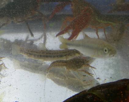 ![]() (写真中央がシマドジョウ、右の魚がカワムツ) |